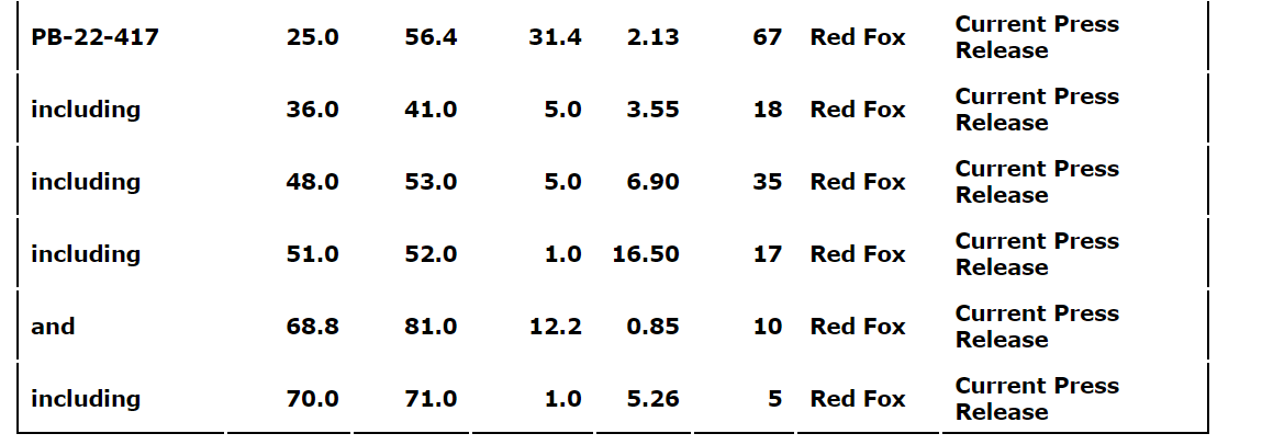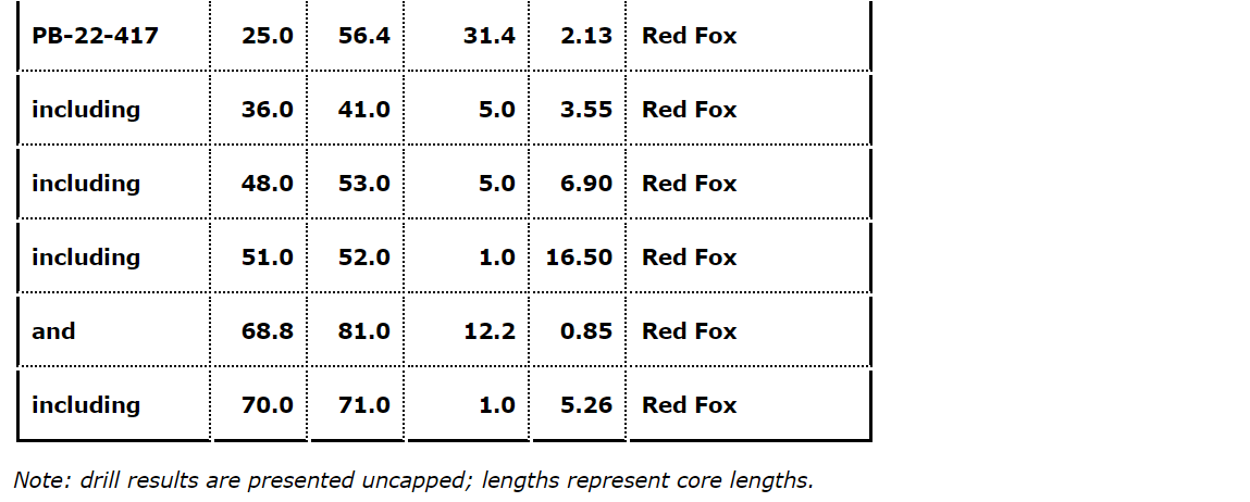 - Diamond drill hole PB-22-417 returned 2.13 grams per tonne gold over 31.4 metres from 25.0 metres to 56.4 metres from the southeastern extent of the Red Fox zone.