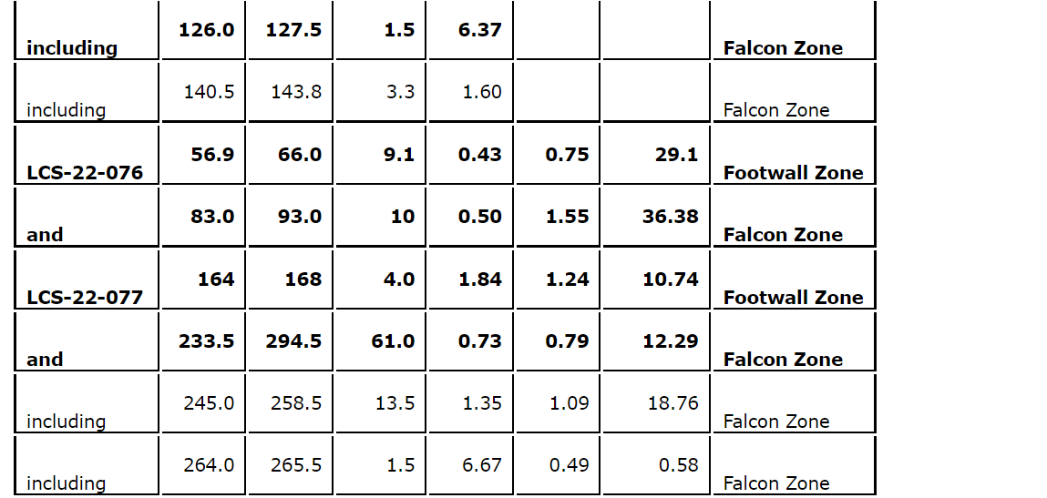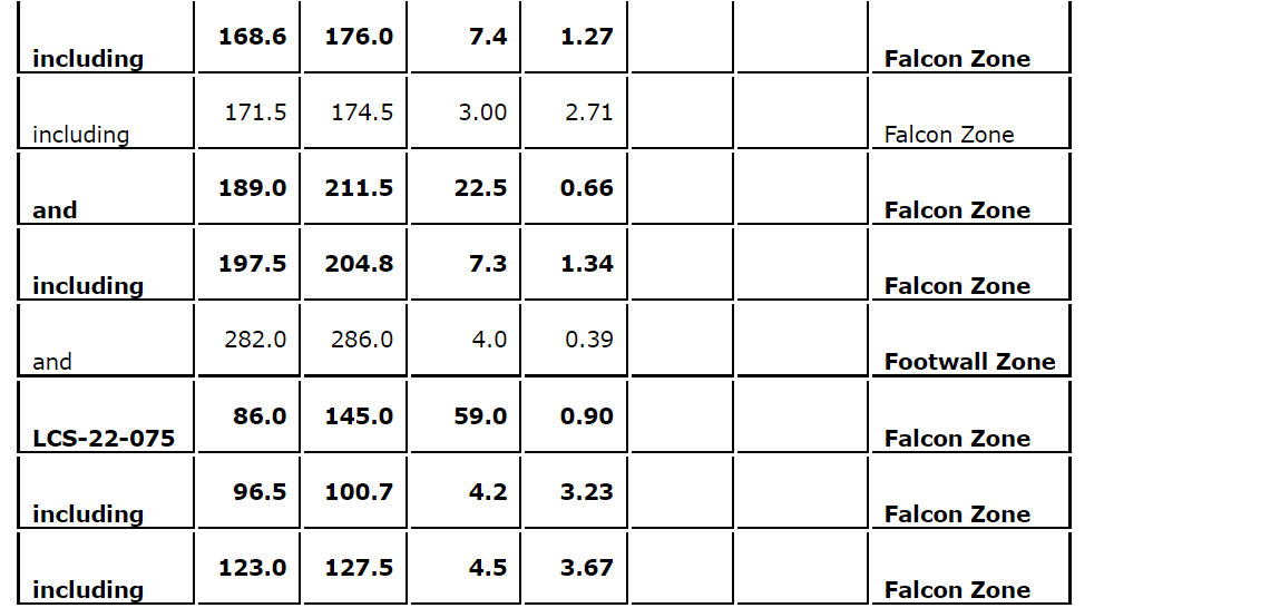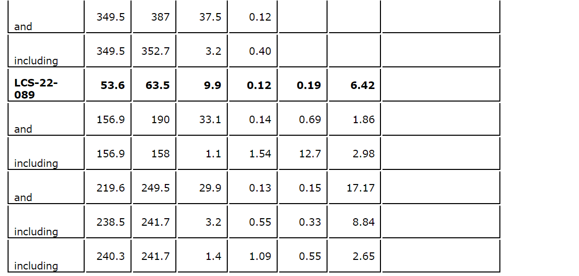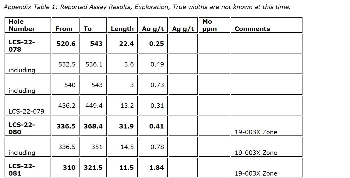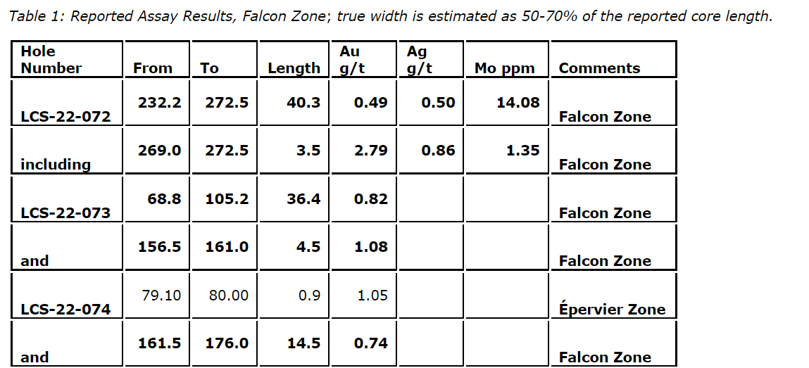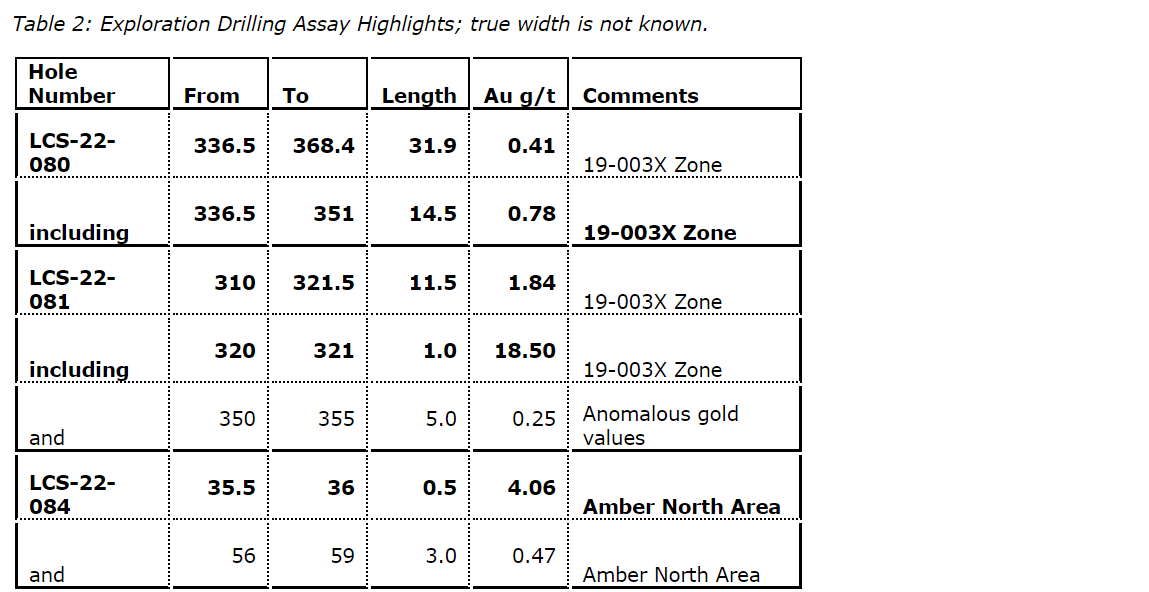 - Diamond drill hole LCS-22-075 returned 0.9 gram per tonne gold over 59.0 metres from 86.0 metres to 145.0 metres, including 3.23 g/t Au over 4.2 metres from 96.5 metres to 100.7 metres and 3.67 g/t Au over 4.5 metres from 126.0 metres to 127.5 metres.