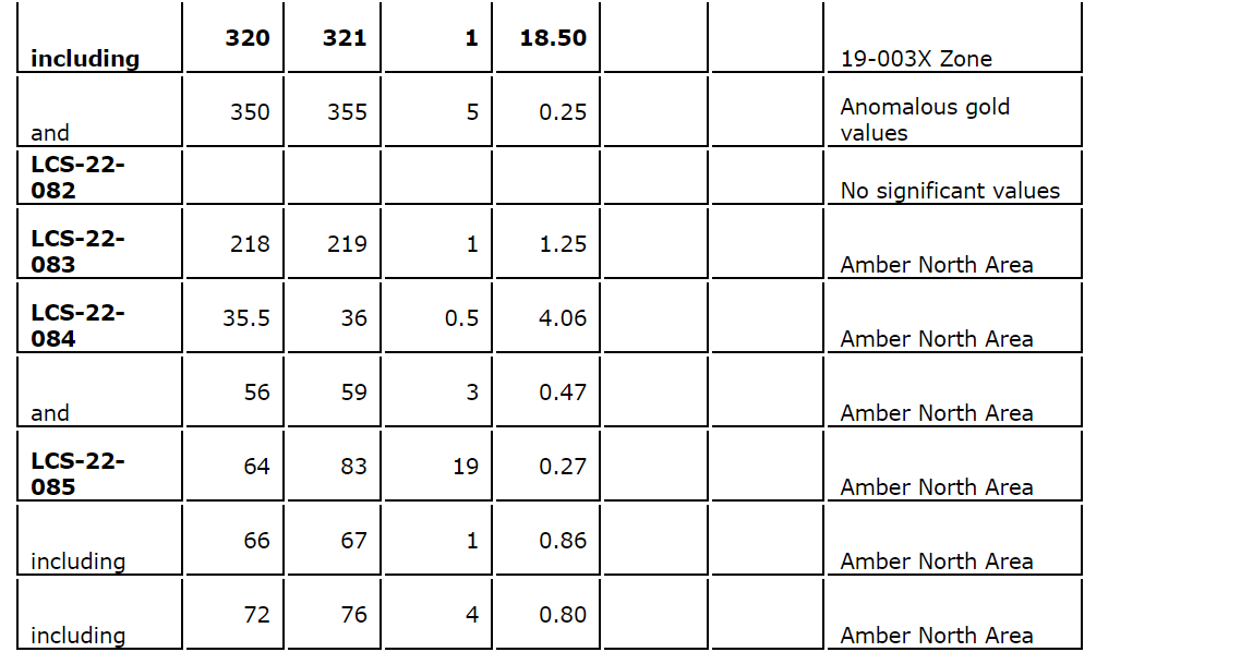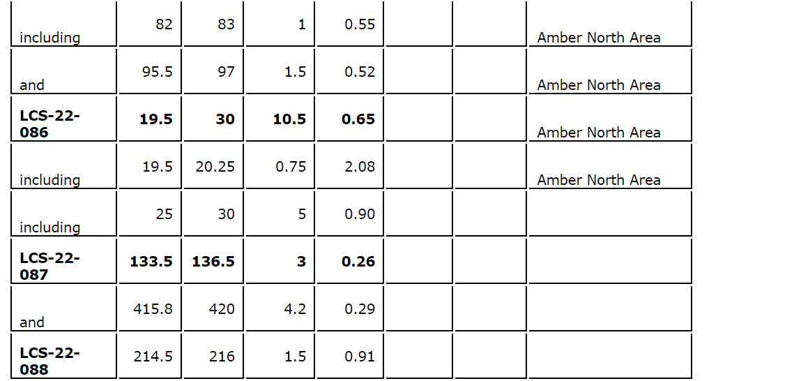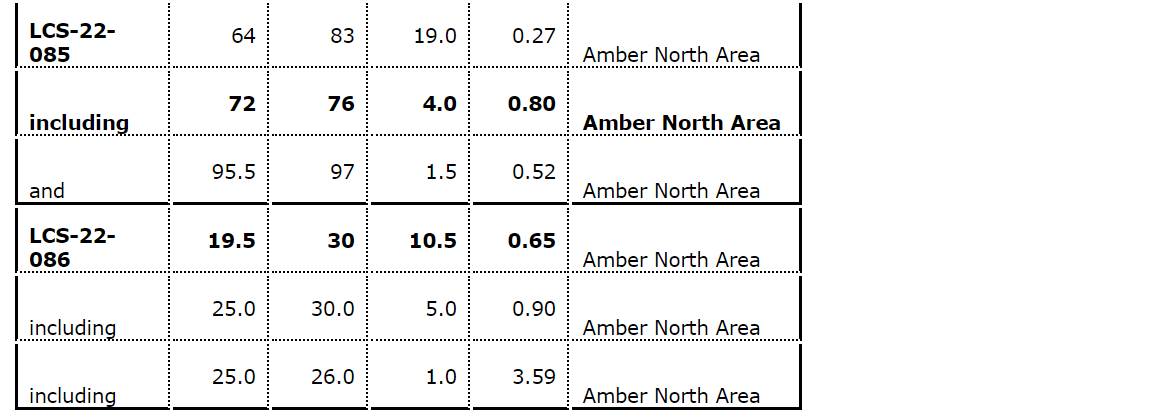 Exploration drilling followed up on previous exploration work northeast of the Amber showing, where a historical intersection returned 0.82 g/t Au over 11.5 metres. Three drill holes tested this trend over 350 metres along strike, with easternmost hole LCS-22-086 returning 0.65 g/t Au over 10.5 metres, LCS-22-085 returning 0.27 g/t Au over 19 metres, including 0.80 g/t Au over 4.0 metres, and LCS-22-084 returning 4.06 g/t Au over 0.5 metres and 0.47 g/t Au over 3.0 metres (see an attached table). The mineralized trend is associated with deformed and altered felsic porphyry dikes within gabbro host rocks and is open along strike and down dip.