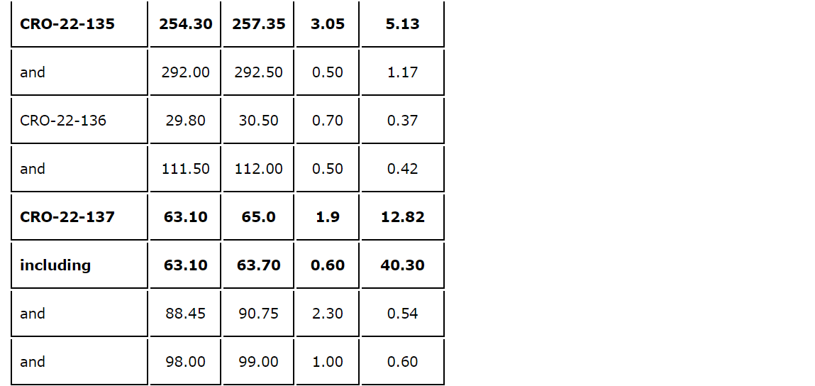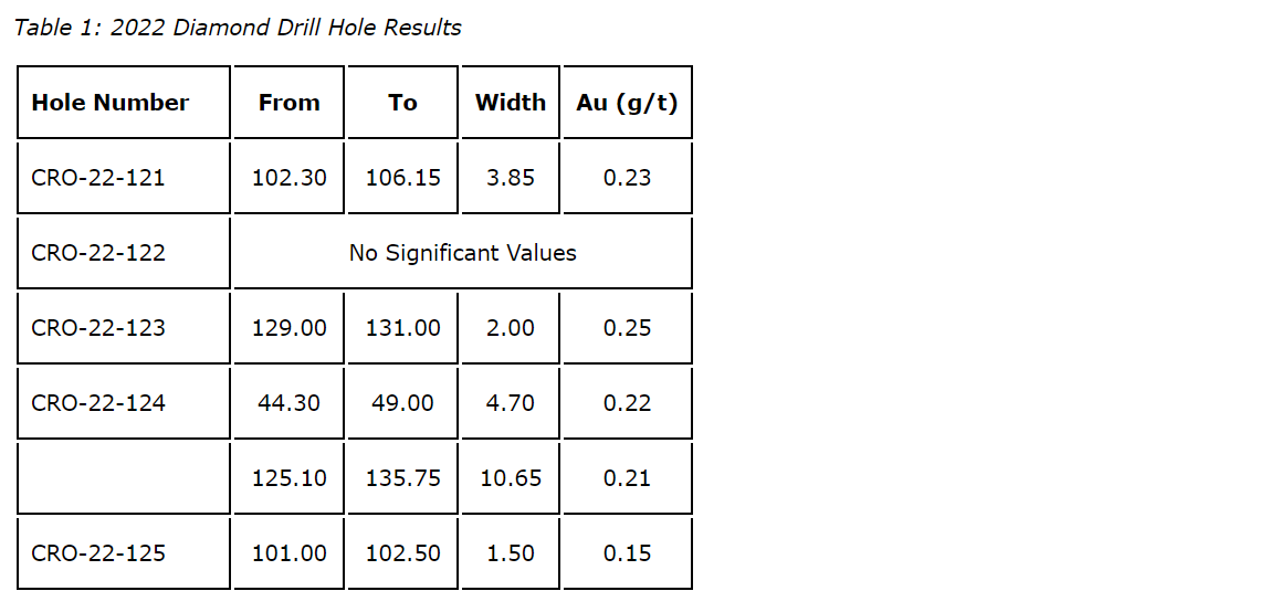 - DDH CRO-22-128 returned 1.32 g/t Au over 12.50 metres starting at 237.25 metres, including 6.58 g/t Au over one metre (on strike of CRO-22-150 and CRO-22-127ext).