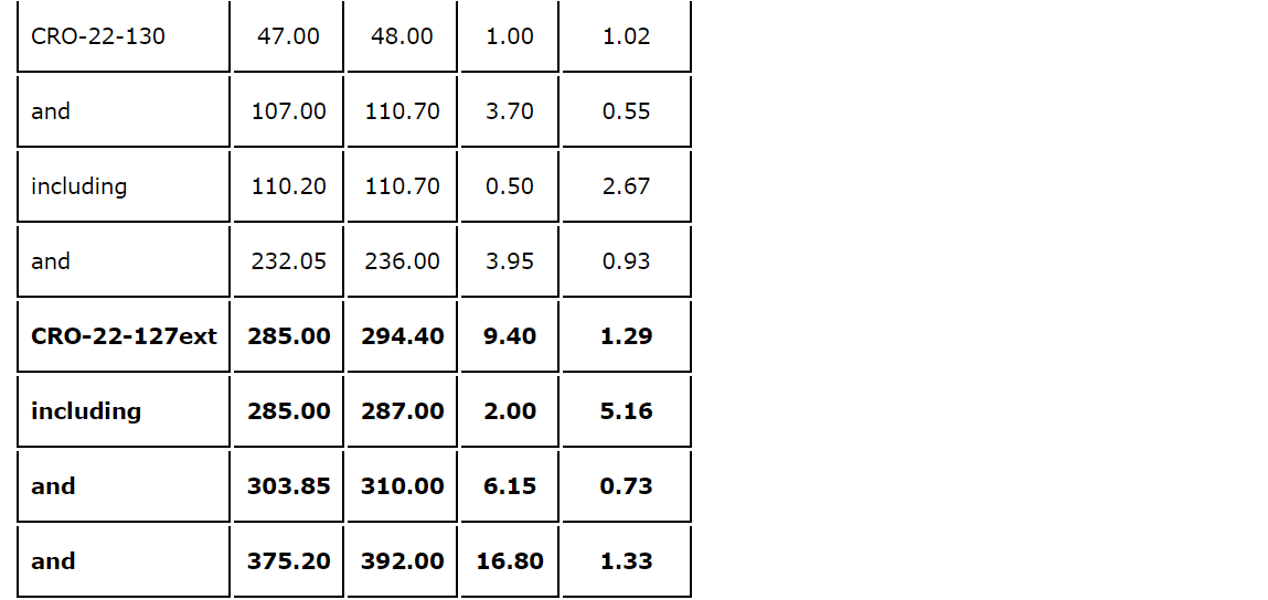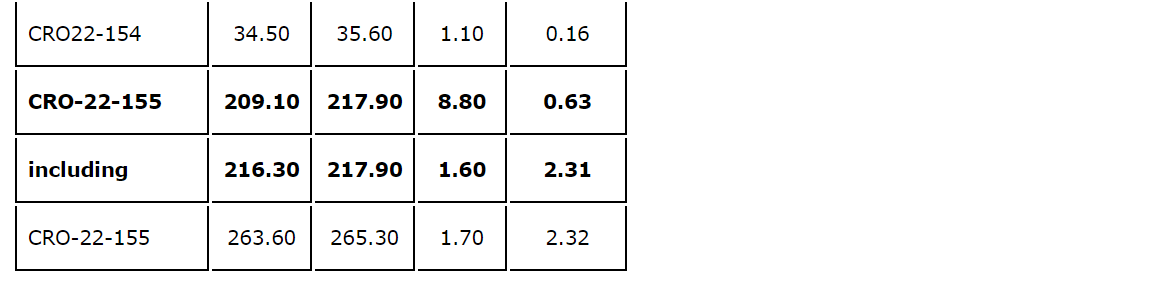 - DDH CRO-22-127ext intersected multiple mineralized zones, including 1.33 g/t Au over 16.80 metres starting at 375.20 metres, including 3.25 g/t Au over 3.5 metres, and 1.29 g/t Au over 9.40 m starting at 285 metres, including 5.16 g/t Au over two m (approximately 250 m east of CRO-22-150 and CRO-22-128).