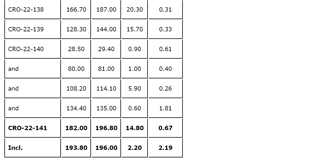 - DDH CRO-22-147 returned 1.31 g/t Au over 13.30 metres starting at 220 metres, including 3.56 g/t Au over 2.90 metres.