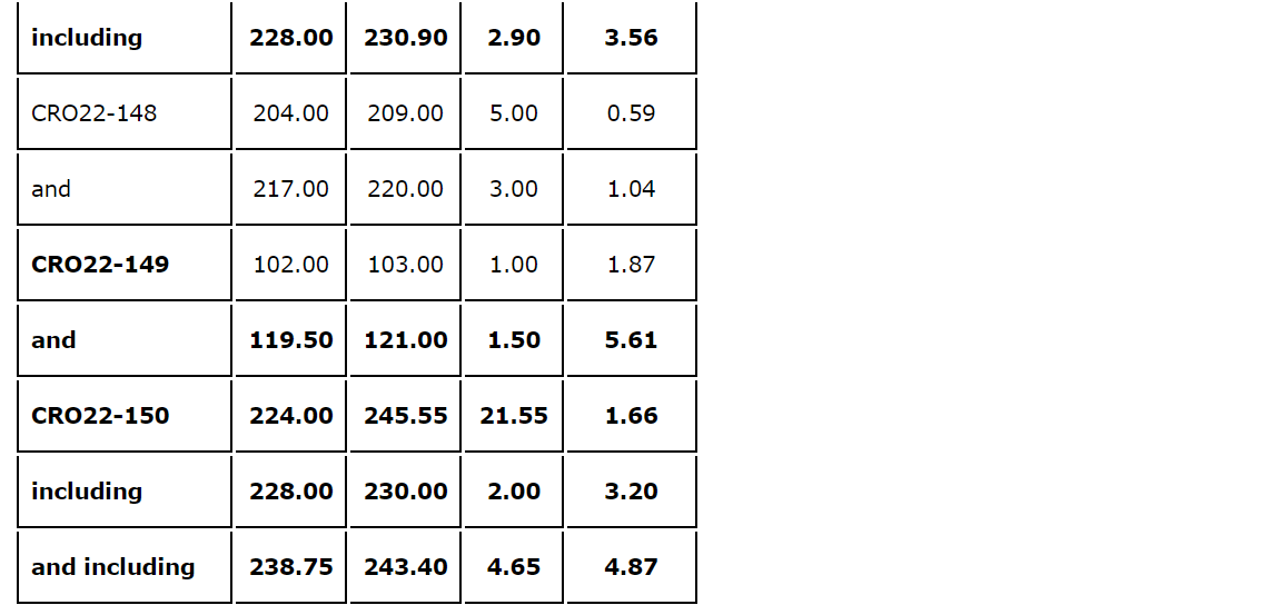 - Diamond drill hole CRO-22-150 intersected multiple mineralized zones, including: 10.94 grams per tonne gold over seven metres starting at 272.10 metres, including 16.15 g/t Au over 4.6 metres; 1.66 g/t Au over 21.55 metres starting at 224.0 metres, including 3.20 g/t Au over 2.0 metres and 4.87 g/t Au over 4.65 metres; 1.26 g/t Au over 7.15 metres starting at 315.85 metres, including 2.70 g/t Au over 2.0 metres; and 0.53 g/t Au over 11.5 metres starting at 330.0 metres.