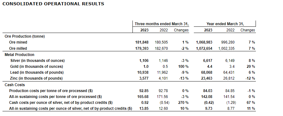 In Q4 fiscal 2023, the company produced approximately 1.1 million ounces of silver, 1,000 ounces of gold, 10.9 million pounds of lead and 3.6 million pounds of zinc, representing an increase of 100 per cent in gold production, and decreases of 3 per cent, 9 per cent and 13 per cent, respectively, in silver, lead and zinc production over Q4 fiscal 2022.