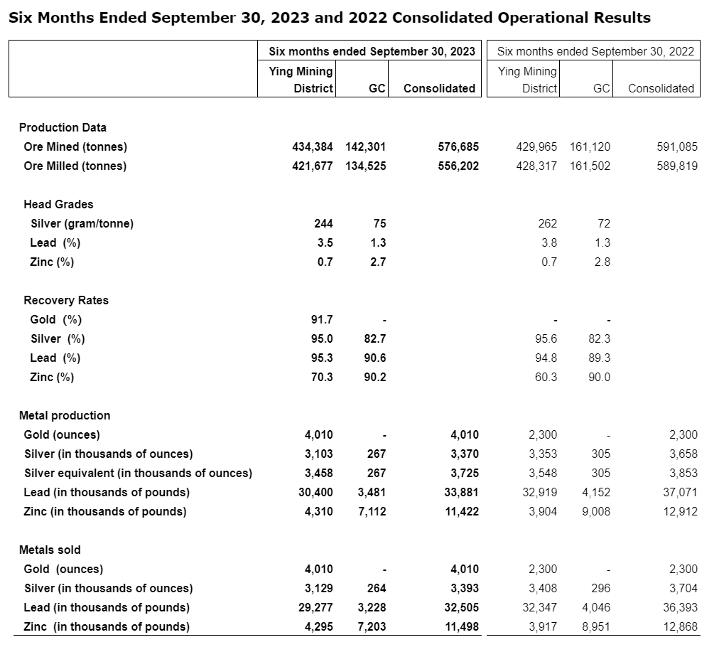 At the GC mine, 52,829 tonnes of ore were mined, down 30 per cent over Q2 fiscal 2023, and 48,239 tonnes of ore were milled, down 36 per cent over Q2 fiscal 2023. Approximately 84,000 ounces of silver, one million pounds of lead and 2.4 million pounds of zinc were produced, representing decreases of 40 per cent, 41 per cent and 40 per cent, respectively, in silver, lead and zinc, over Q2 fiscal 2023. The decrease was mainly due to a production disruption of five weeks due to a series of improvement measures and a districtwide cessation of industrial activity associated with improvements made to the provincial power grid at the GC mine in Q2 fiscal 2024 (refer to the company's Sept. 5, 2023, news release).