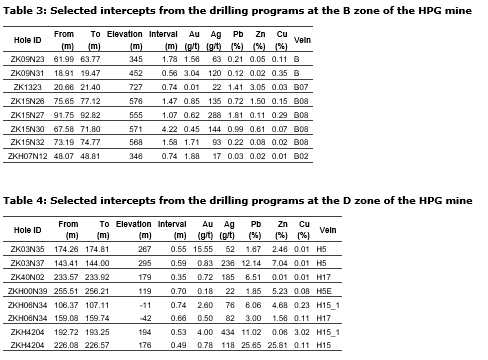 The majority of the drilling campaign targeted areas of known Au-Ag-Pb-Zn vein structures that were previously underexplored due to higher-than-expected variation in the thickness and trend of the high-grade ore shoots of the veins within the resource areas below the 600-metre amsl elevation. The high-grade intercepts are mainly associated with the northwest-dipping H5 series, H15 series, H16 series, H17 series, H11, H13 and H14, and the east-dipping H20 series, H41 series, H32 series, H29, H40 and H42 veins. These intercepts have led to significant expansion and upgrading of high-grade resources.