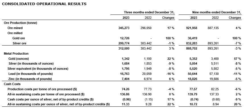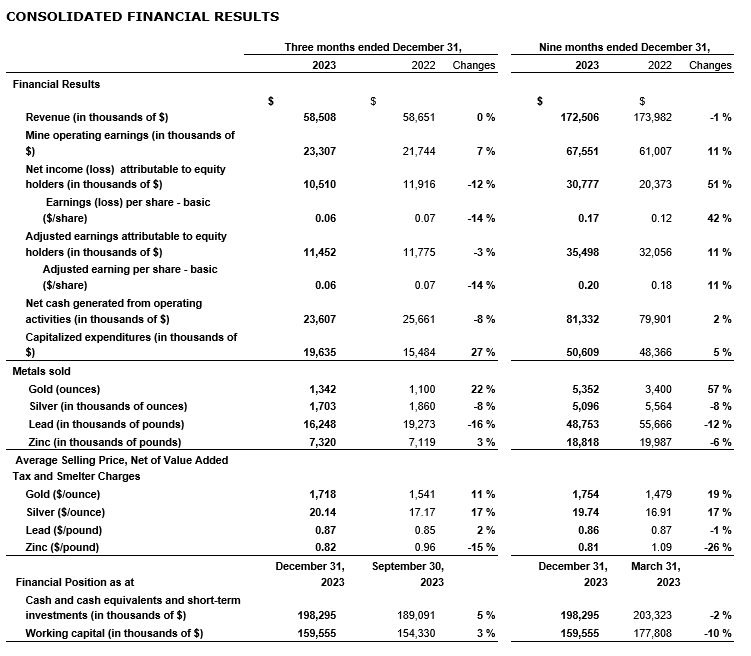 Compared with Q3 fiscal 2023, the company's consolidated financial results in the current quarter were mainly impacted by: (i) increases of 11 per cent, 17 per cent and 2 per cent, respectively, in the realized selling prices for gold, silver and lead, and a decrease of 15 per cent in the realized selling price for zinc; (ii) increases of 22 per cent and 3 per cent, respectively, in gold and zinc sold and decreases of 8 per cent and 16 per cent, respectively, in silver and lead sold; (iii) a decrease of 4 per cent in per-tonne production costs; (iv) an improvement of $4.4-million in mark-to-market investments; and (v) an increase of $5.0-million in the share of loss in associates.