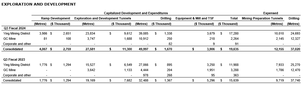 Income from mine operations in Q3 fiscal 2024 was $23.3-million, up 7 per cent compared with $21.7-million in Q3 fiscal 2023. Income from mine operations at the Ying mining district was $21.5-million, compared with $19.0-million in Q3 fiscal 2023. Income from mine operations at the GC mine was $1.9-million, compared with income of $2.9-million in Q3 fiscal 2023.