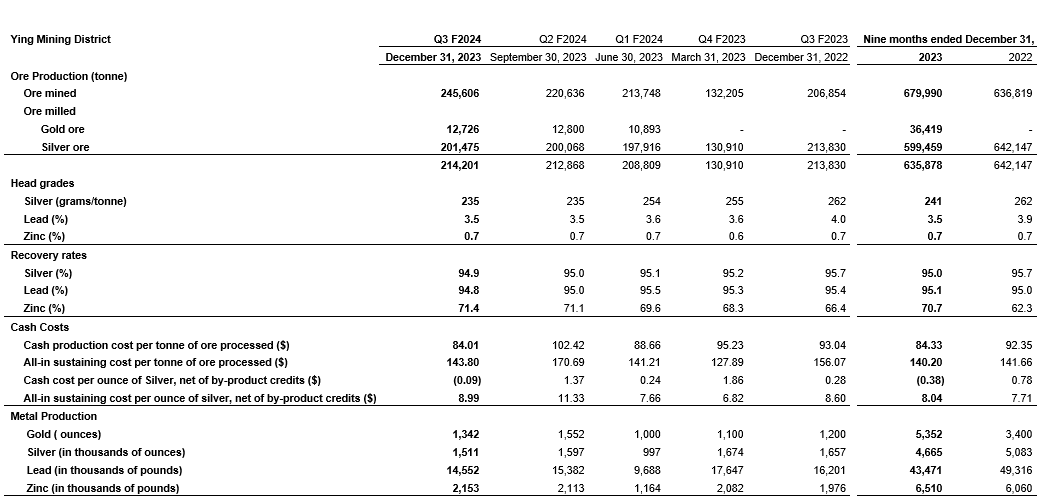 An attached table summarizes the operating results at the Ying mining district for the past five quarters and for the nine months ended Dec. 31, 2023, and Dec. 31, 2022.