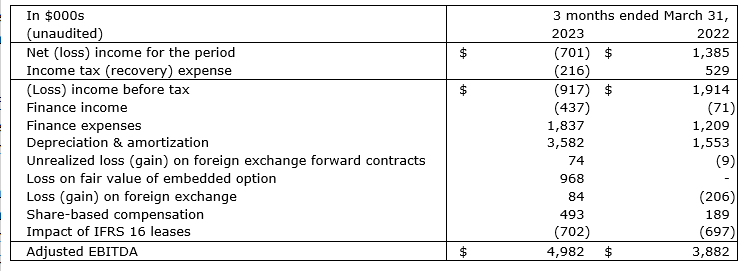 Adjusted EBITDA (earnings before interest, taxes, depreciation and amortization) (1) was up by 28 per cent, or $1.1-million, to $5.0-million for the first quarter. The improvement was driven mainly by the positive impact of increased sales volume.