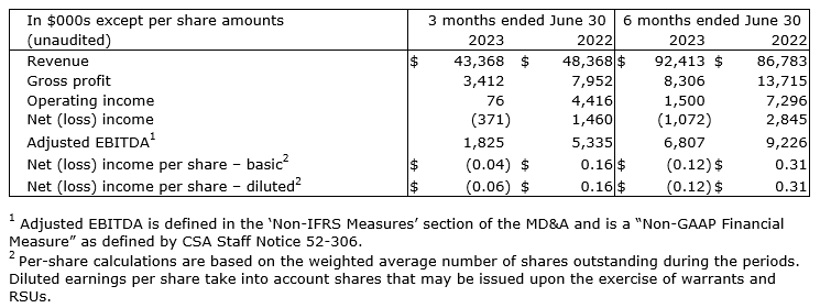 Revenue for the second quarter was $43.4-million, a decline of $5.0-million or 10 per cent compared with the same period in 2022. First-half revenue was $92.4-million, an increase of $5.6-million or 6 per cent. The decline in Q2 revenue was expected and resulted from temporary capacity constraints, which negatively impacted volumes, while all production was consolidated in Delta before the second new production line there was operational. The impact on the year-to-date result was partially offset by increased business during Q1 from customers in preparation for the transition.