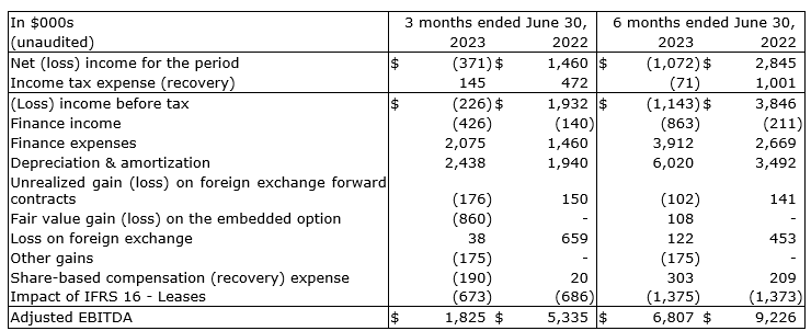 Swiss Water defines adjusted EBITDA as net income before interest, depreciation, amortization, impairments, share-based compensation, gains/losses on foreign exchange, gains/losses on disposal of property and capital equipment, fair value adjustments on embedded options, loss on extinguishment of debt, adjustment for the impact of IFRS 16 -- Leases, and provision for income taxes and other non-cash gains related to a remeasurement of asset retirement obligation. The company's definition of adjusted EBITDA also excludes unrealized gains and losses on the undesignated portion of foreign exchange forward contracts.