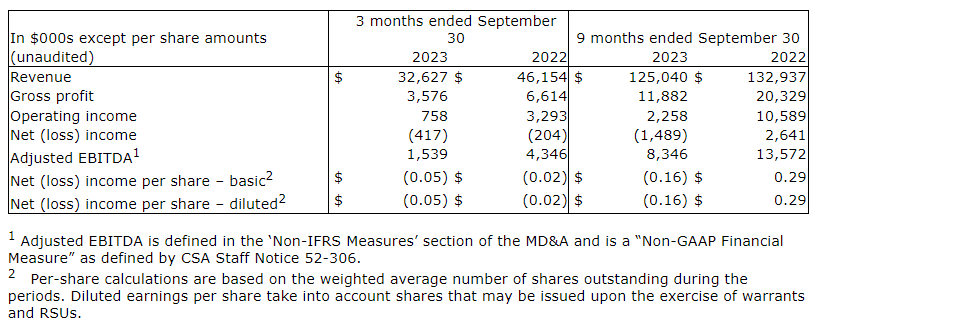 - Revenue for the third quarter and nine months ended Sept. 30, 2023, was $32.6-million and $125.0-million respectively, representing a decrease of $13.5-million for the quarter and $7.9-million for the year to date, when compared with the same periods in 2022. The drop in revenue resulted from a material decline in the NY'C' coffee commodity price and the temporary reduction in production capacity during the transition from Burnaby to Delta. The impact of these factors on nine-month revenues was partially offset by the increased volumes shipped in Q1, and a higher United States-dollar exchange rate this year.