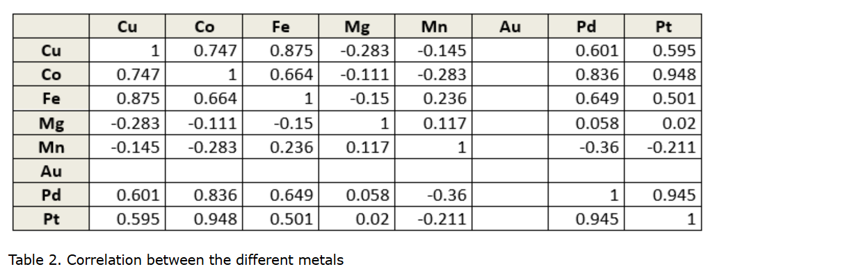 multielement analysis shows a strong positive correlation between nickel, cobalt, iron and platinum group metals (PGEs) (r equals 0.83 to 0.95), suggesting a common magmatic sulphide origin.