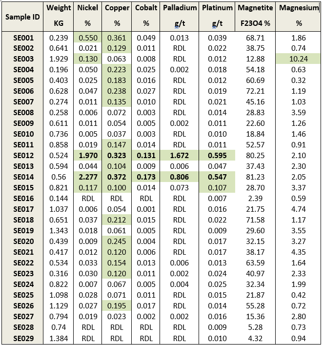 All samples were collected by a team of experienced prospectors and analyzed by IGS Laboratories, an ISO/IEC 17025 accredited facility in Delson, Québec. Analytical methods included 4-acid digestion with ICP-OES for base metals and fire assay ICP-OES for PGEs.