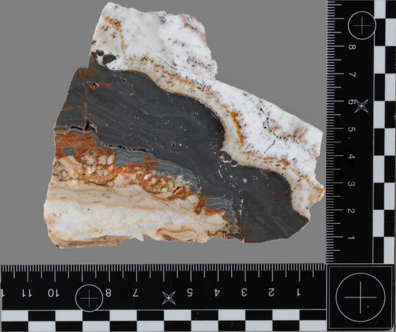 Figure 2 : Échantillon de minéralisation présentant un rubanement rythmique typique. La zone noire est composée de pyrite à grains très fins. Cet échantillon libre a été trouvé sur le site et sera envoyé pour analyse.