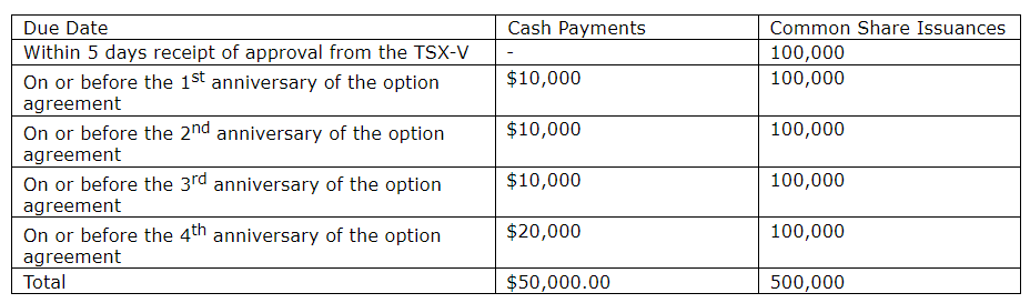 The agreement: The company can earn a 100-per-cent interest in and to the Mine Road project by making the cash payments and common share issuances