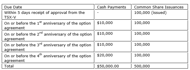 The company can earn a 100-per-cent interest in and to the Mine Road project by making cash payments and common share issuances over a period of four years, as shown in the attached table.
