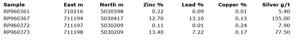 QA-QC Procedures: The Company collected 14 grab samples from float and bedrock and delivered them directly to Activation Laboratories Ltd. in Fredericton for 41 element ICP-OES analysis. Samples that were over-limit for silver, lead and zinc were re-assayed using Actlabs procedure 8AR.