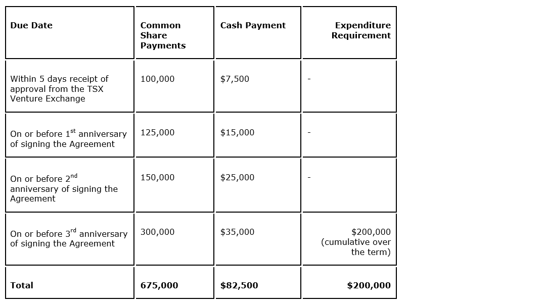 The agreement and proposed share issuances remain subject to approval by the TSX Venture Exchange. All security issuances will be subject to a statutory hold period of four months and one day from issuance in accordance with Canadian securities laws. No finders' fees were paid on this agreement.