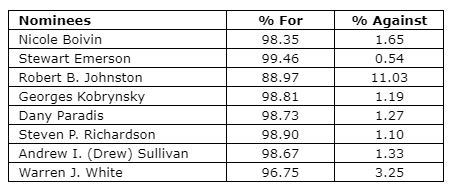 A total of 13,722,153 common shares were voted at the meeting representing 52.82% of all outstanding shares. Shareholders voted in favour of the election of all directors' nominees as follows: