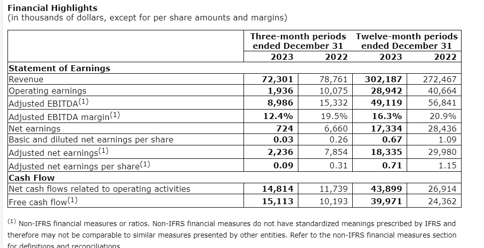 Adjusted net earnings were $2.2-million or nine cents per share for the three-month period ended Dec. 31, 2023, compared with $7.9-million or 31 cents per share for the equivalent period in 2022.
