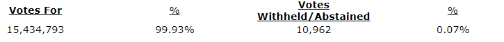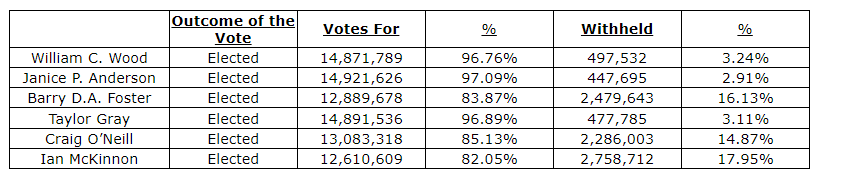 All of the nominees proposed as directors of the company were duly elected as directors of the company with votes cast by the shareholders present in person or represented by proxy at the meeting as shown in the attached table.