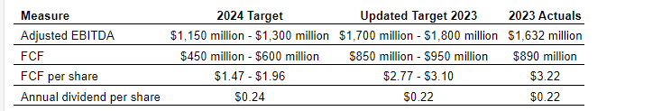 Announced an enhanced common share repurchase program for 2024 of up to $150-million toward the repurchase of common shares, representing up to 40 per cent of 2024 FCF guidance being returned to shareholders in the form of share repurchases and dividends;