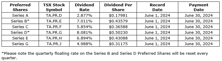 The board of directors of TransAlta Corp. has declared a quarterly dividend of six cents per common share payable on July 1, 2024, to shareholders of record at the close of business on June 1, 2024.