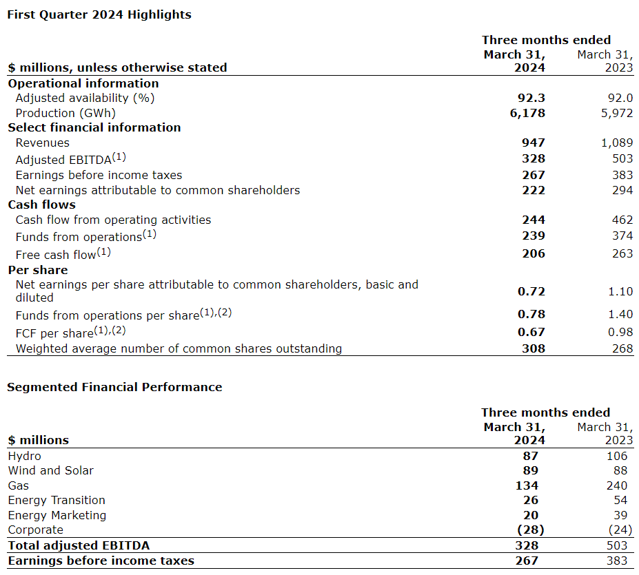 - Wind and solar adjusted EBITDA increased by $1-million, or 1 per cent, compared with the same period in 2023, primarily due to higher environmental attribute revenues, higher production from the return to service of the Kent Hills wind facilities, the commercial operation of the Garden Plain and White Rock West wind facilities, and the Northern Goldfields solar facilities, partially offset by lower realized power prices in Alberta and weaker wind resource across the Alberta operating fleet;