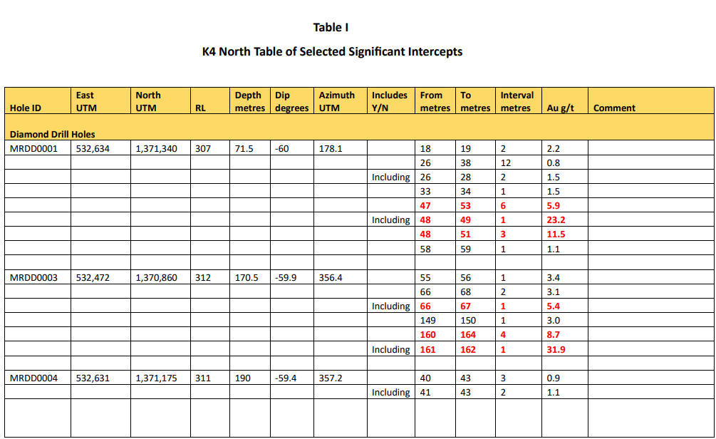 Significant gold drill intercepts from K4 North are listed in the table entitled "K4 North table of selected significant intercepts."