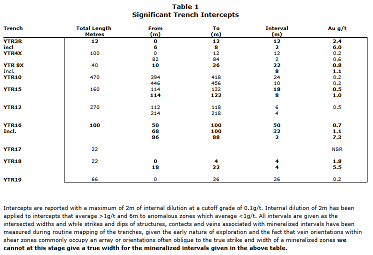 In detail, trench YTR16 was extended 80 m to the south of the original 20-metre-long YTR16 for a total length of 100 m and the extended trench encountered mineralization from 50 m returning 50 m of 0.7 g/t gold from 50 m to the end of trench, with the interval from 68 to 100 m returning 32 m of 1.1 g/t, including two m of 7.3 g/t gold from 86 to 88 m.