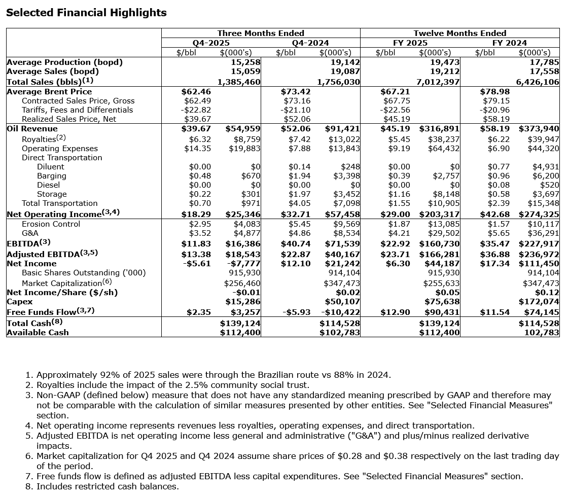 Petrotal Corp. has released its operating and financial results for the three months and year ended Dec. 31, 2025. All amounts herein are in U.S. dollars unless stated otherwise.