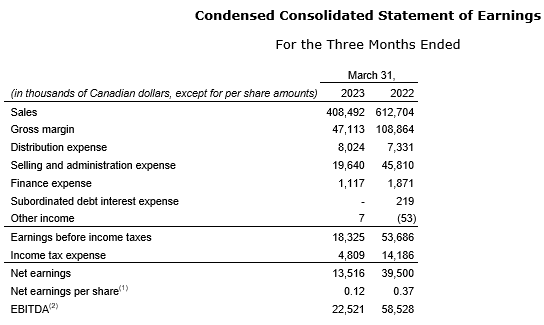 Net earnings for the quarter ended March 31, 2023, decreased to $13.5-million from $39.5-million over the same period last year primarily due to decreased gross margin.