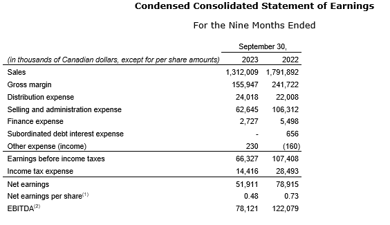 Net earnings for the nine-month period ended Sept. 30, 2023, were $51.9-million, compared with $78.9-million for the same period last year. The decrease in net earnings was primarily due to decreased gross margins during the period.