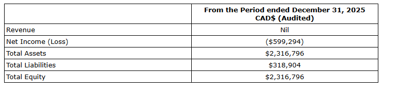 The attached table presents selected information on the financial condition and results of operations for Juno. Such information is derived from the audited financial statements of Juno for the period from incorporation to Dec. 31, 2025. The information provided herein should be read in conjunction with Juno's financial statements, which will be contained in the filing statement to be filed on SEDAR+ in connection with the proposed transaction.