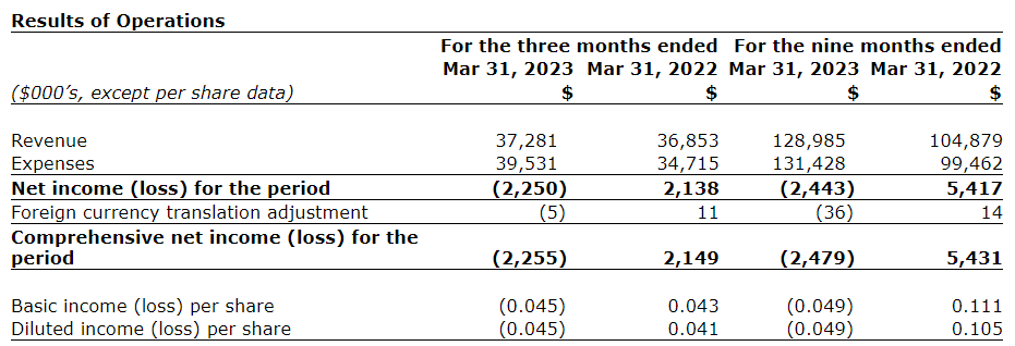 For more information please see the financial statements and the management's discussion and analysis (MD&A) for the three and nine months ended March 31, 2023, available on SEDAR and the company's website.