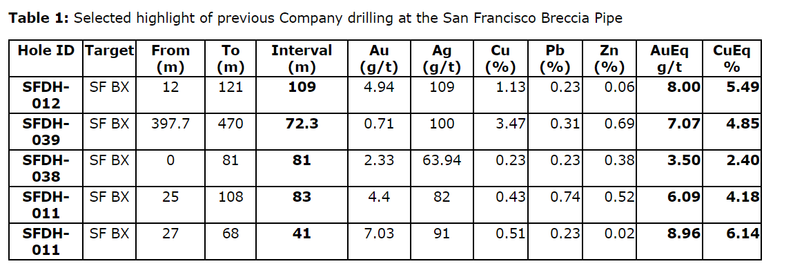 "While the San Francisco breccia pipe is an outstanding high-grade asset, we are pleased to add the Ethan breccia to our portfolio of mineralized breccias. It's encouraging to see the strong copper mineralization in shallow drilling at Ethan, a breccia pipe that is nearly four times the width of the San Francisco pipe, and our team is currently reviewing and modelling the results."