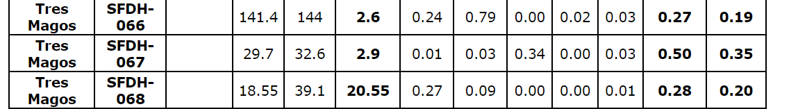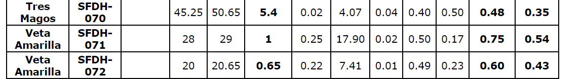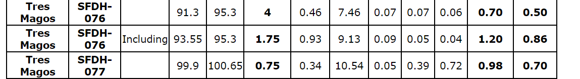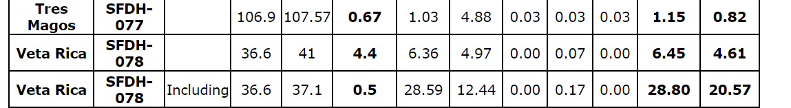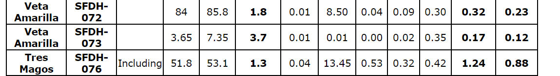 Three other prospects were tested during the program. Eight holes were drilled to test intrusion-hosted stockwork veining at Tres Magos, returning multiple short intervals of silver-lead-zinc plus or minus Cu-Au mineralization (i.e., 1.3 m of 0.5 per cent Cu, 13 g/t Ag, 0.3 per cent Pb and 0.4 per cent Zn (0.9 per cent CuEq) from 51.8 m (SFDH-076)). Three holes were drilled to test intermediate-sulphidation, epithermal veins at Veta Amarilla, which returned short intervals of Ag-Au-Pb-Zn mineralization (i.e., one m at 18 g/t Ag, 0.3 g/t Au, 0.5 per cent Pb and 0.2 per cent Zn (0.5 per cent CuEq) from 28 m (SFDH-071)). Three holes testing low-sulphidation, epithermal quartz veins at Veta Alumbrera did not return any significant results. Intersections for all prospects are listed in an attached table.