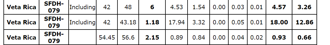 8.75 m at 3.5 g/t Au from 42 m (SFDH-079):
