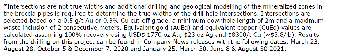 Including 10 m at 0.72 per cent Cu, 0.53 g/t Au and five g/t Ag (1.2 per cent CuEq) from six m.