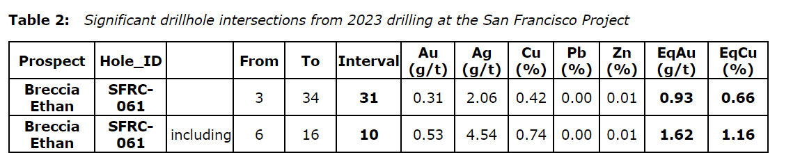 31 m at 0.42 per cent Cu, 0.31 g/t Au and two g/t Ag (0.66 per cent copper equivalent) from three m (SFRC-061):