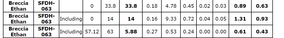 33.8 m at 0.45 per cent Cu, 0.18 g/t Au and five g/t Ag (0.63 per cent CuEq) from surface (SFDH-063):