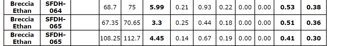 Eight m at 0.71 per cent Cu, 0.68 g/t Au and one g/t Ag (1.2 per cent CuEq) from 27 m (SFDH-062);