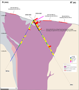 - 33.8 m @ 0.45 % Cu, 0.18 g/t Au & 5 g/t Ag (0.63 % CuEq); SFDH-063 from surface.