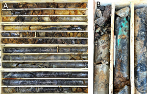 Cu-Au breccia mineralization at Breccia Ethan (A) Typical quartz-tourmaline-pyrite-chalcopyrite-chalcocite breccia (SFDH-063, 13 to 40 m). (B) Strong malachite staining of a quartz-tourmaline breccia. From a 0.9m long sample that returned 0.79 g/t Au, 5.8 g/t Ag & 0.66 % Cu (SFDH-063, 21.75-22.65m). Photographs are of a selected interval and is not necessarily representative of mineralisation hosted throughout the property.