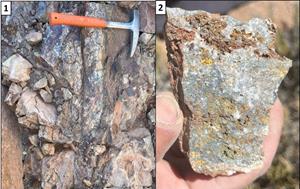 Photographs from the current Veta Rica sampling program (locations in Figure 4): (1) low sulphidation epithermal quartz vein hosted in strongly sericite-altered granodiorite. (2) ) Quartz vein displaying strong boxwork texture (hematite and jarosite) after weathered sulphides. Assays for both sites pending.