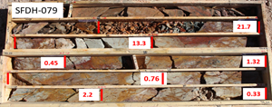 - 8.75 m @ 3.5 g/t Au; SFDH-079 from 42 m.