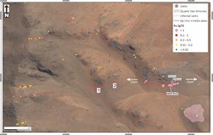 Figure 5: Follow up mapping and sampling at Veta Rica area has already defined a series of quartz veins along-strike and in parallel to the drilled outcrop. This low sulfidation epithermal system has been mapped up to 1.5km from the drill site, and remains open along-strike and at depth. Detailed sampling of all veins is underway, with assays pending. Numbers refer to photos in Figure 6.