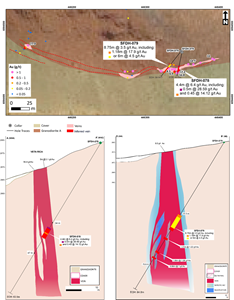 - 4.4 m @ 6.4 g/t Au; SFDH-078 from 36.6 m.